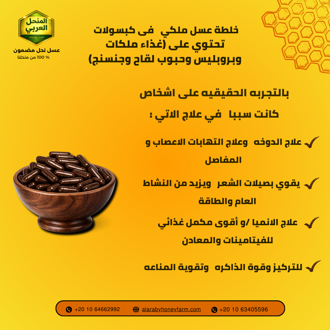 الخلطه الملكيه السحرية – 60 كبسوله كبسولات الطاقة المتكاملة (غذاء ملكات، عكبر، وحبوب لقاح)