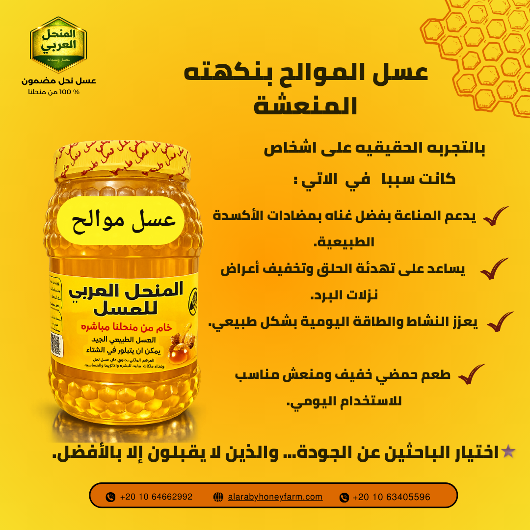 ختاما فإن اقتناء عسل الموالح الطبيعي من المنحل العربي هو استثمار حقيقي وناجح في صحتك وعافيتك وعافية أبنائك. إن التوازن الفريد والرائع بين الطعم المنعش والفوائد الصحية العميقة يجعل من هذا العسل منتجا لا غنى عنه في أي مطبخ عصري. سواء كنت تبحث عن تقوية جهازك المناعي أو زيادة طاقتك اليومية المتجددة أو حتى العناية بجمال بشرتك فإن عسل الموالح يوفر لك كل ذلك وأكثر في عبوة واحدة ممتلئة بالخير والنقاء والبركة. انضم الآن إلى عالم المنحل العربي الواسع واستمتع بجودة العسل الحقيقية كما لم تذقها من قبل فنحن هنا لنقدم لك الأفضل دائما لأنك تستحق كل التميز والجودة.